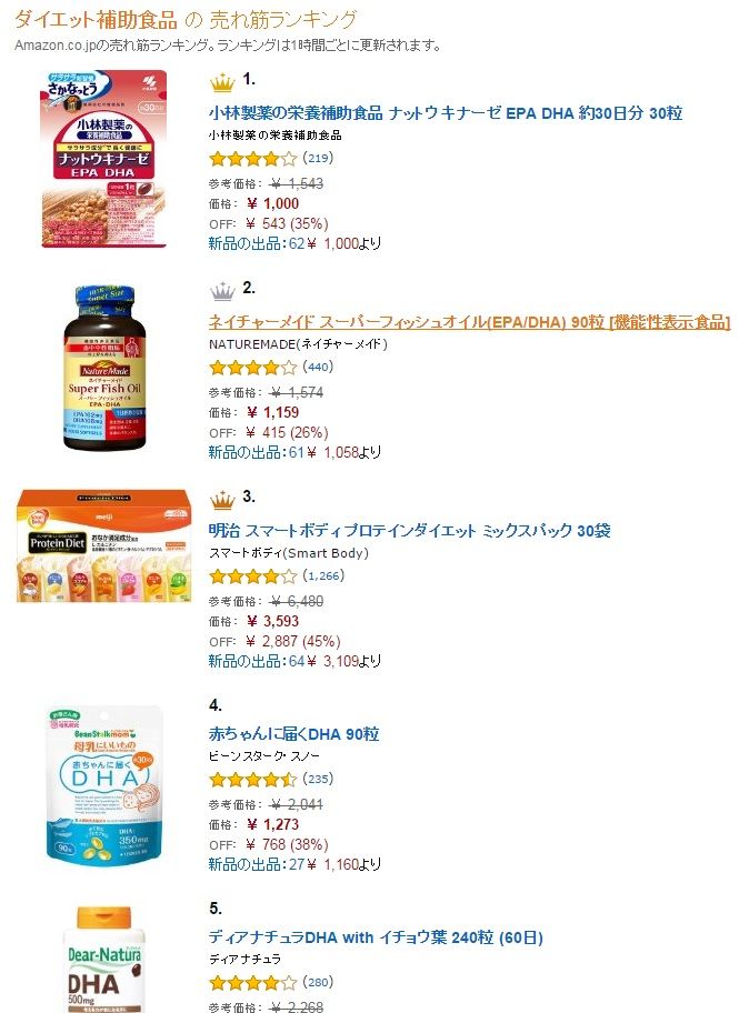 2015年12月07日 amazonダイエット補助食品ランキング コメント数:0 コメント カテゴリ:ダイエット by kari_shop EPA/DHAの効能 amazonダイエット補助食品ランキング amazon12/07のダイエット補助食品のランキングです。 ナットウキナーゼが一番人気(・_・;)EPAとDHAが取れるのが大きいのでしょうね